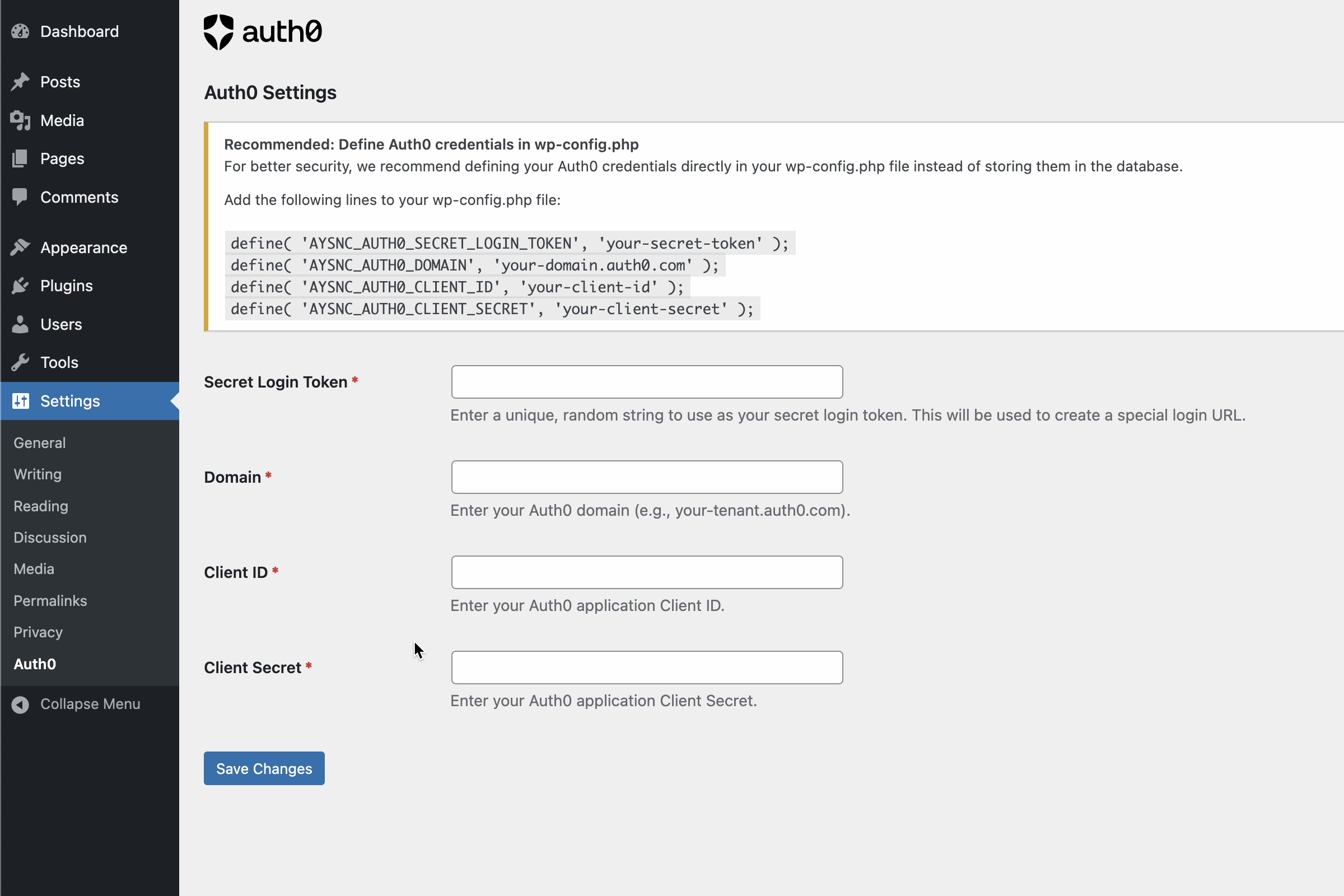 3. Configure the plugin through Settings > Auth0 or by adding constants to wp-config.php
